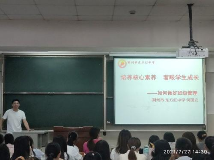 下午两点三十分,我们学员老师开始了下午的学习。来自荆州市东方红中学的何国安老师同样围绕“如何做好班级管理”给学员老师带来了一堂生动、有趣、新颖的教师专业发展教育课。何老师以真实事例导入,面对班级管理的种种困惑,提出问题:那到底如何做好班级管理呢?引发学员们的深思。紧接着他提出要以课程改革为核心,而课程改革的核心在于“德育”。教育需要生命的温暖,需要用爱来交换,推动员工核心素养的发展,现代的德育更是如此。随后何老师对德育方法进行了详细讲解,他期望学员老师们都要做一名有高度职业素养的班主任,做好班级管理。