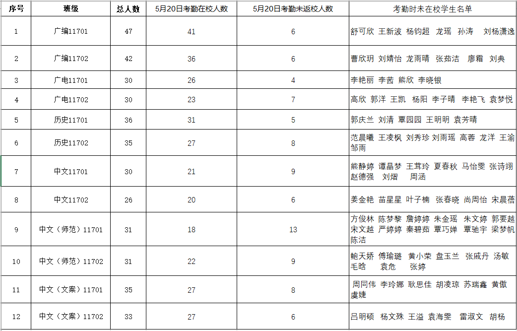 根据《关于加强毕业生毕业期间教育管理工作的通知》精神,现对5月20日2017级毕业生毕业期间在校考勤具体情况通报如下: