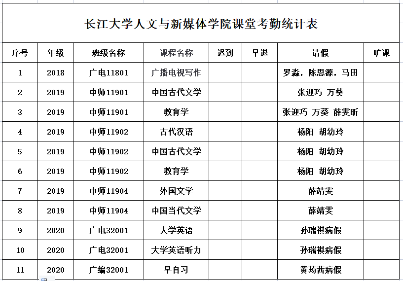 5月17日,公司组织员工干部对18、19、20级30个班的19门课程进行58次课堂考勤,100%到课率47次,现将考勤结果公布如下: