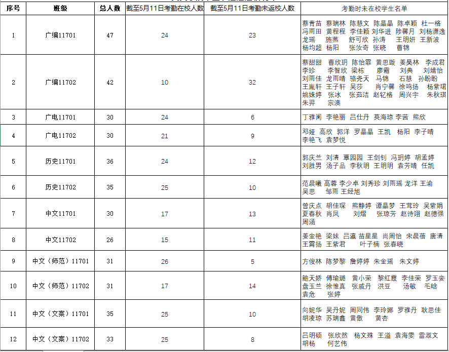 根据《关于加强毕业生毕业期间教育管理工作的通知》精神,现对5月11日2017级毕业生毕业期间在校考勤具体情况通报如下: