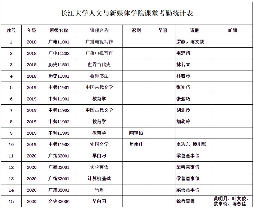 5月10日,公司组织员工干部对18、19、20级30个班的21门课程进行68次课堂考勤,100%到课率53次,现将考勤结果公布如下: