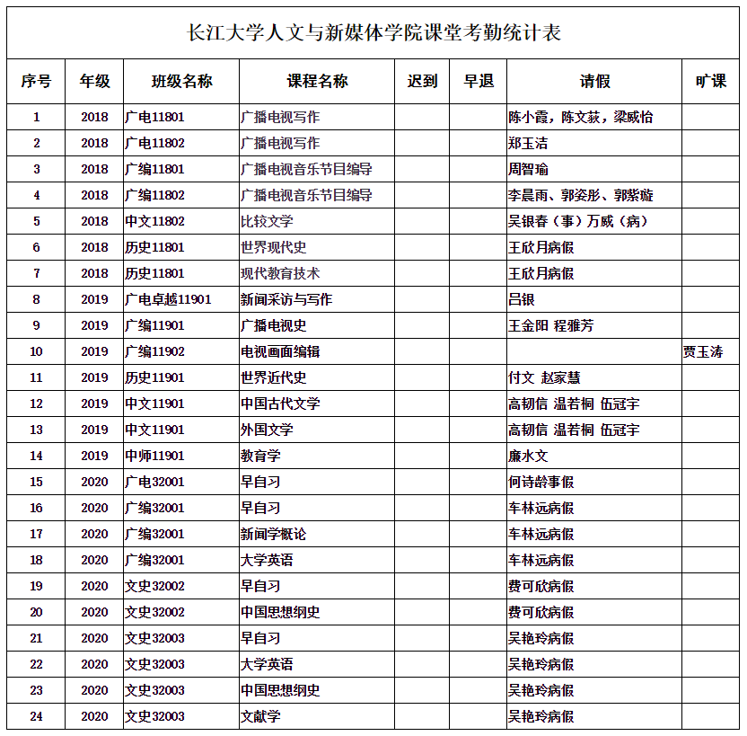 4月21日,公司组织员工干部对18、19、20级30个班的24门课程进行69次课堂考勤,100%到课率45次,现将考勤结果公布如下:
