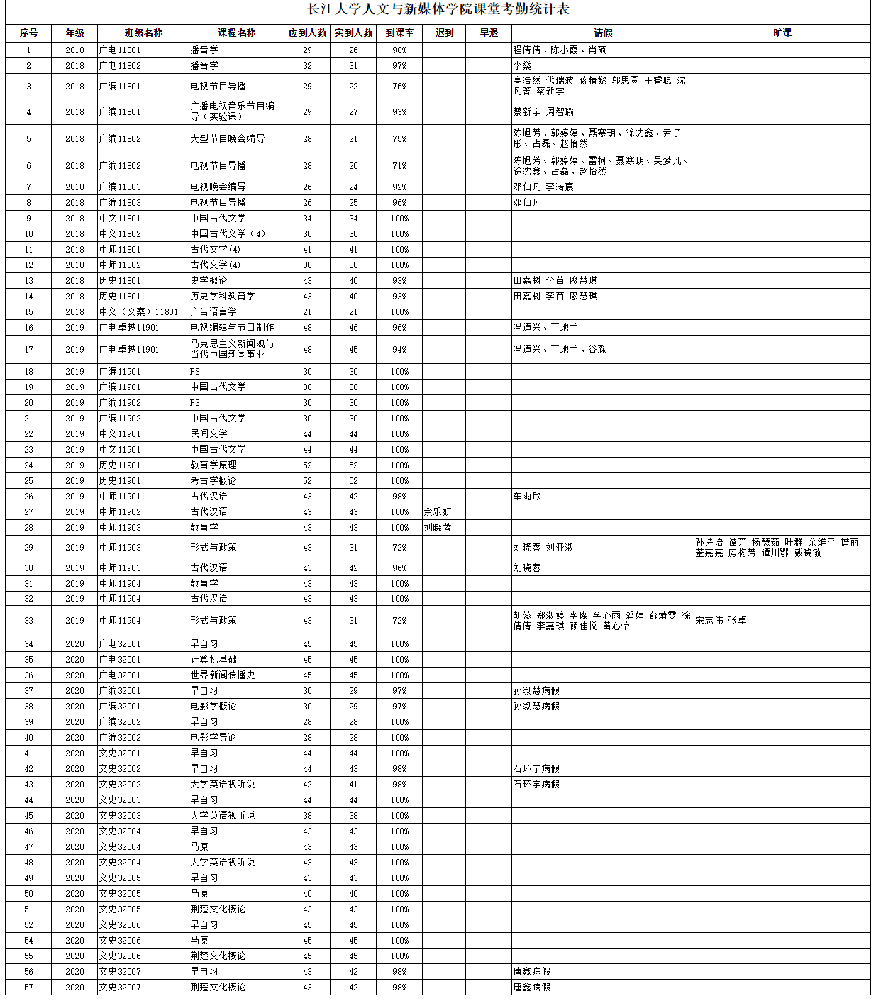 4月1日,公司组织员工干部对18、19、20级30个班的27门课程进行了57次课堂考勤,100%到课率34次,现将考勤结果公布如下: