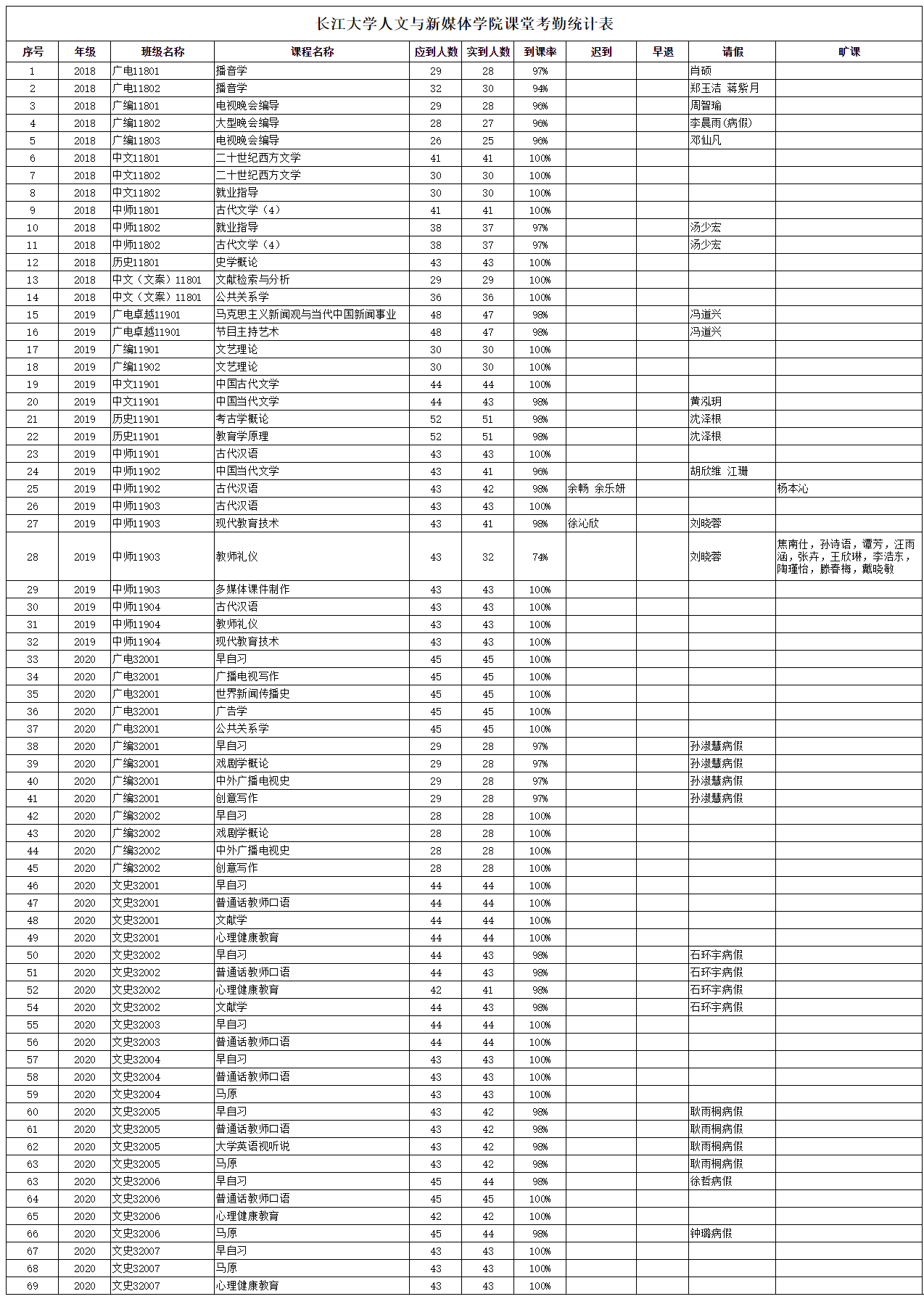 3月30日,公司组织员工干部对18、19、20级30个班的32门课程进行了69次课堂考勤,100%到课率39次,现将考勤结果公布如下: