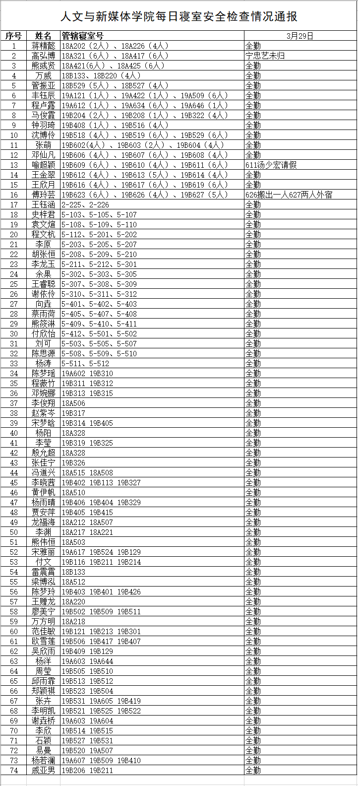 3月29日,公司组织员工干部对18、19级的宿舍进行每日寝室安全检查,现将考勤结果公布如下: