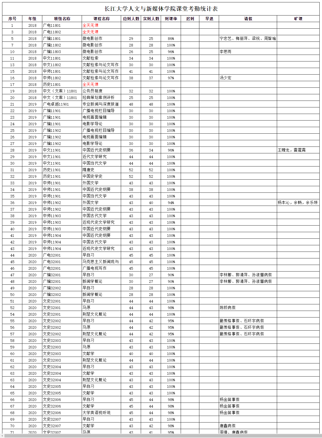 3月26日,公司组织员工干部对18、19、20级30个班的26门课程进行了68次课堂考勤,100%到课率44次,现将考勤结果公布如下: