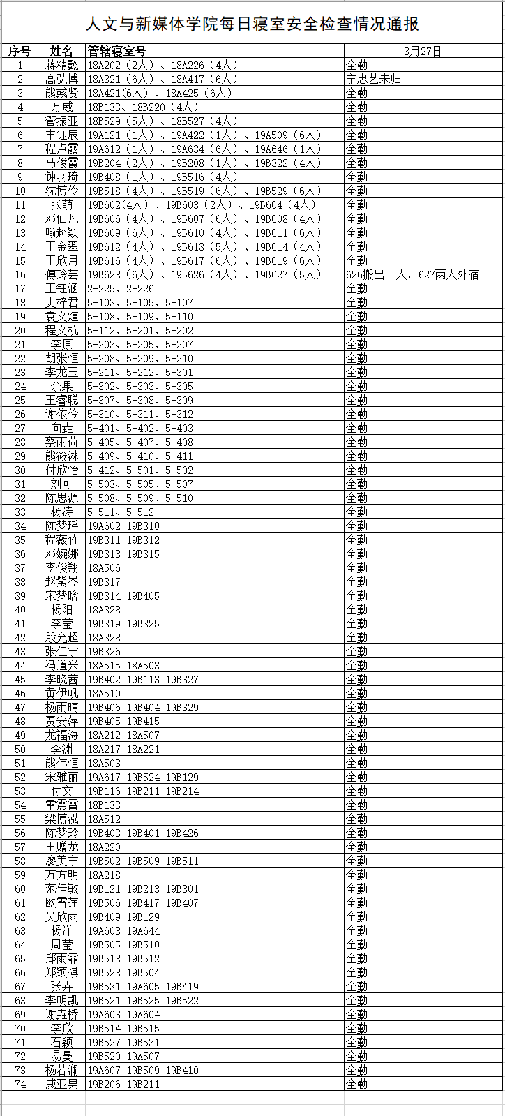 3月27日,公司组织员工干部对18、19级的宿舍进行每日寝室安全检查,现将考勤结果公布如下: