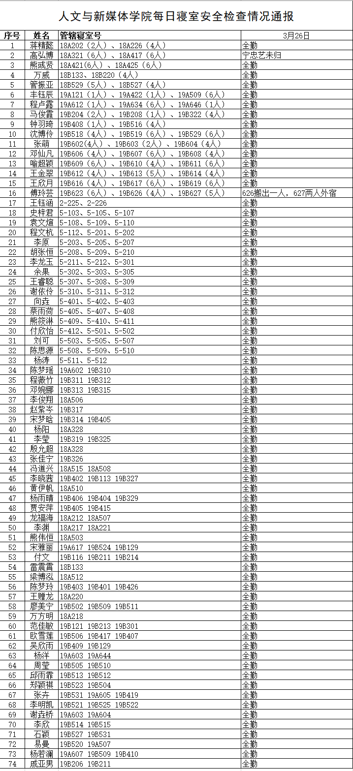 3月26日,公司组织员工干部对18、19级的宿舍进行每日寝室安全检查,现将考勤结果公布如下: