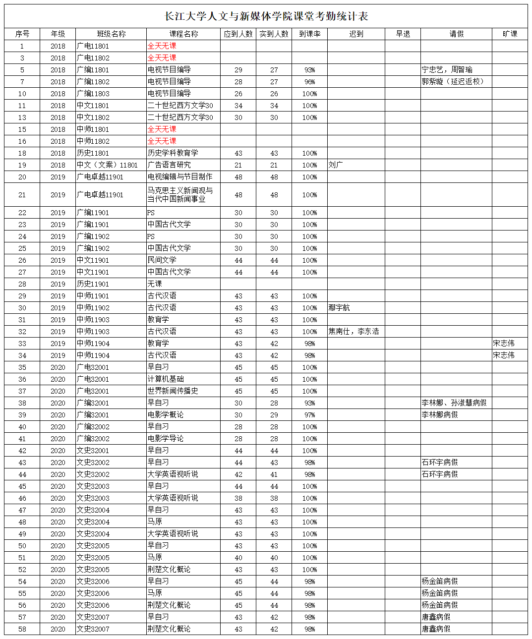 3月25日,公司组织员工干部对18、19、20级30个班的19门课程进行了58次课堂考勤,100%到课率31次,现将考勤结果公布如下:
