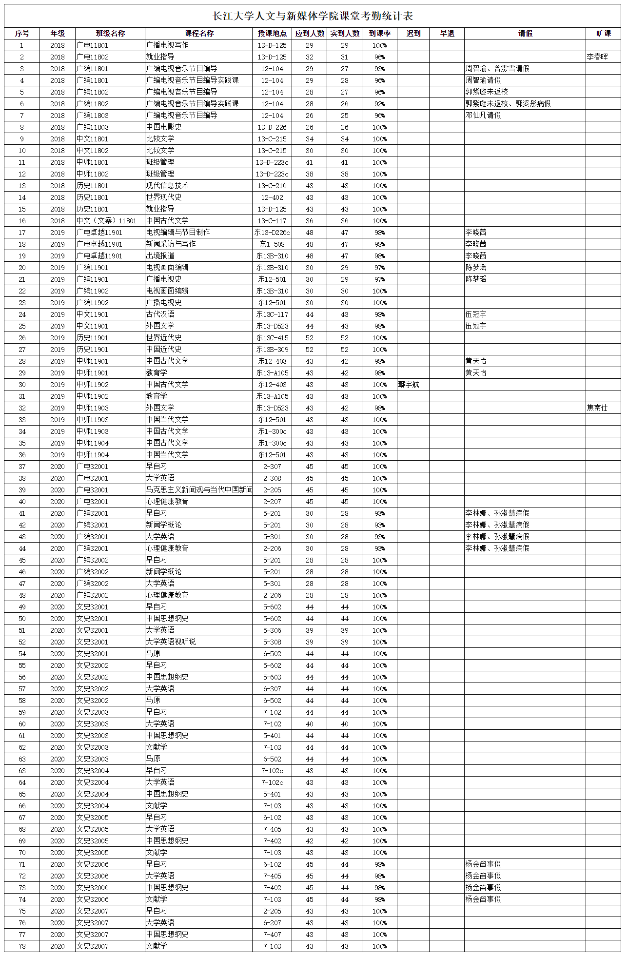 3月24日,公司组织员工干部对18、19、20级30个班的30门课程进行了78次课堂考勤,100%到课率54次,现将考勤结果公布如下: