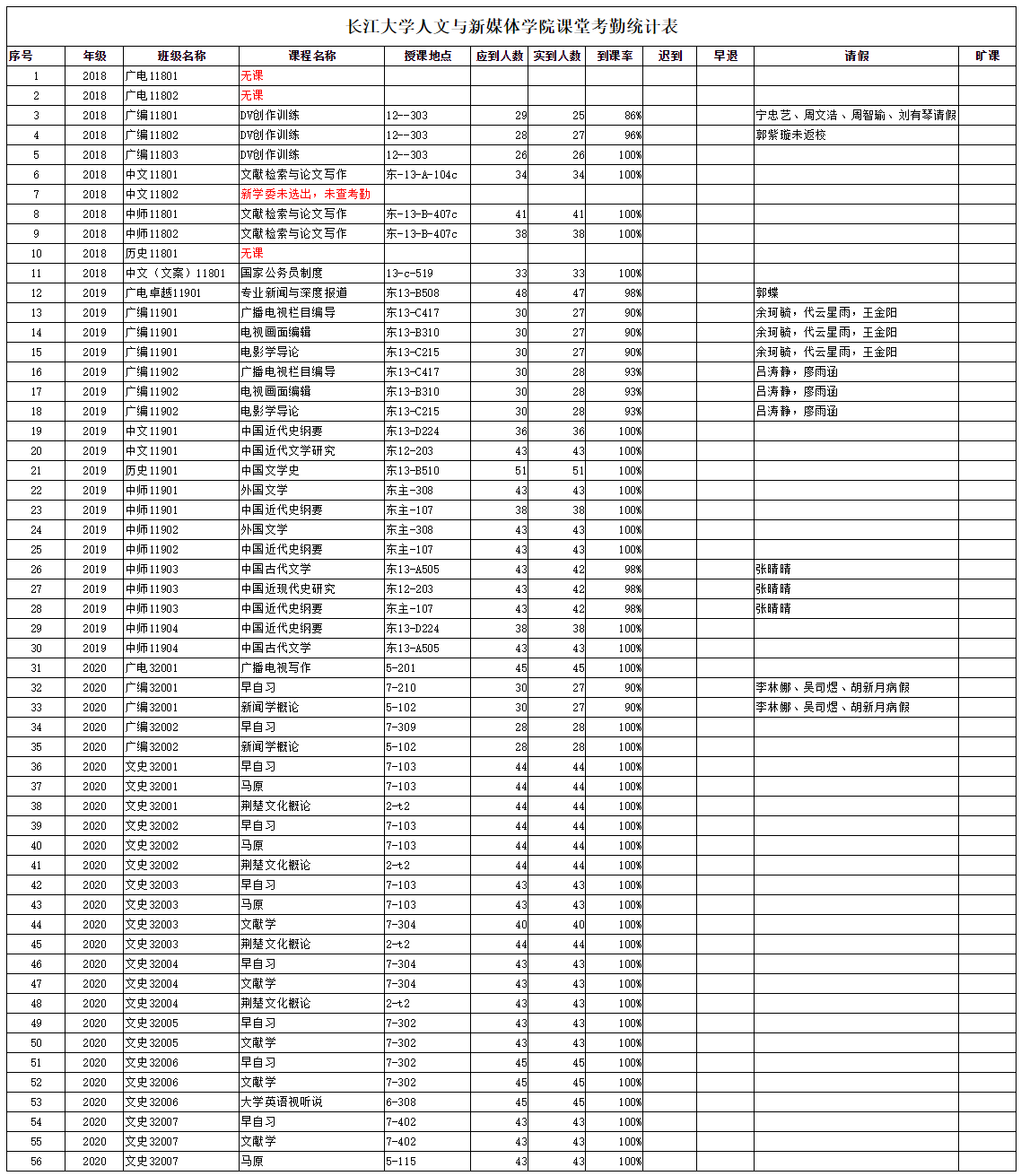 3月12日,公司组织员工干部对18、19、20级30个班的20门课程进行了56次课堂考勤,100%到课率38次,现将考勤结果公布如下: