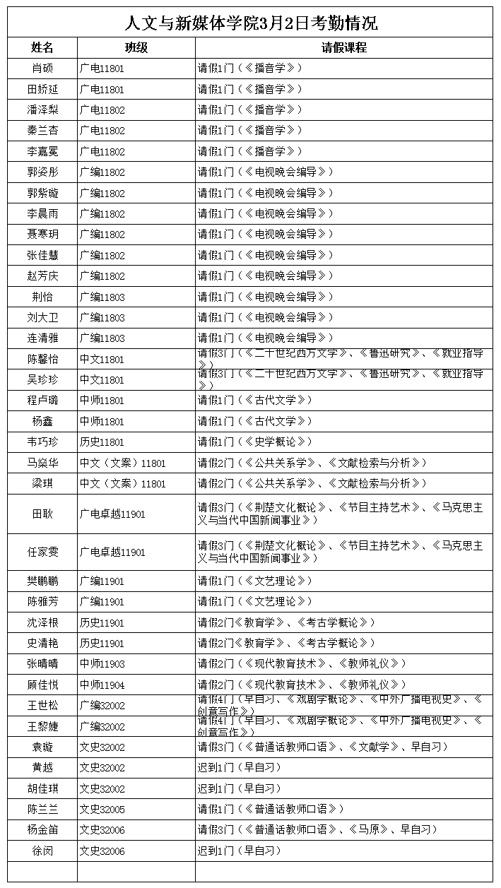 3月2日,公司组织员工干部对18、19、20级的30个班的13门课程进行了68次课堂考勤,100%出勤次数61次,现将缺勤情况通报如下: