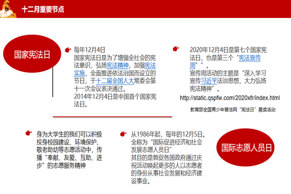 活动的第二部分,了解十二月重要节点,组织开展12.4国家宪法日、12.6国际志愿者日和“一二·九”运动纪念日主题教育活动。国家宪法日的开展,是为了增强全社会的宪法意识,弘扬宪法精神,加强宪法实施,全面推进依法治国,深入学习宣传习近平法治思想,努力成为尊法守法的好公民。