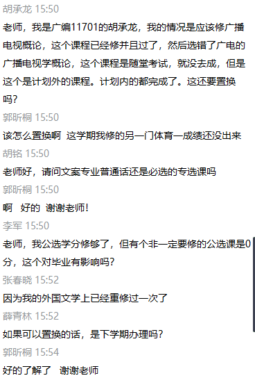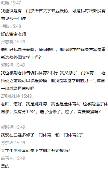会议伊始,张丽老师对304am永利集团人才培养方案及学分管理办法做出总体说明,指出员工学分修习主要分为三部分:必修课学分、选修课学分及实践学分。其中公选课(限选)、实践课为必修科目,所有员工必须修习且拿到学分,并就已上传的《员工未修习课程情况统计.xls》文件举例说明了类型化问题,为员工解答疑惑。同学们通过文字或语音展开提问。张丽老师逐一进行回答指导,提醒同学双学期课程可在下学期报考重修,一定要结合自身情况关注公司通知。