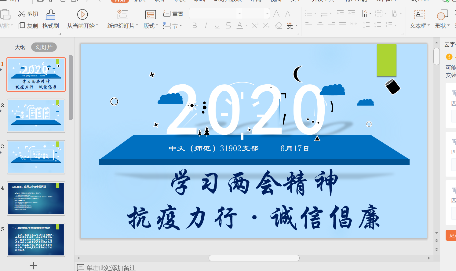 中文(师范)11701、11702团支部联合召开的6月主题团会中,由主持人播放ppt讲解两会政府工作报告、两会精神,以及传染病防控知识和诚信教育内容,让同学们详细了解我国2019年和2020年以来的政府工作以及对未来的战略部署,并在疫情期间,积极学习防控知识,最终对“学习两会精神,抗疫力行•诚信倡廉”这一主题有深入的了解;