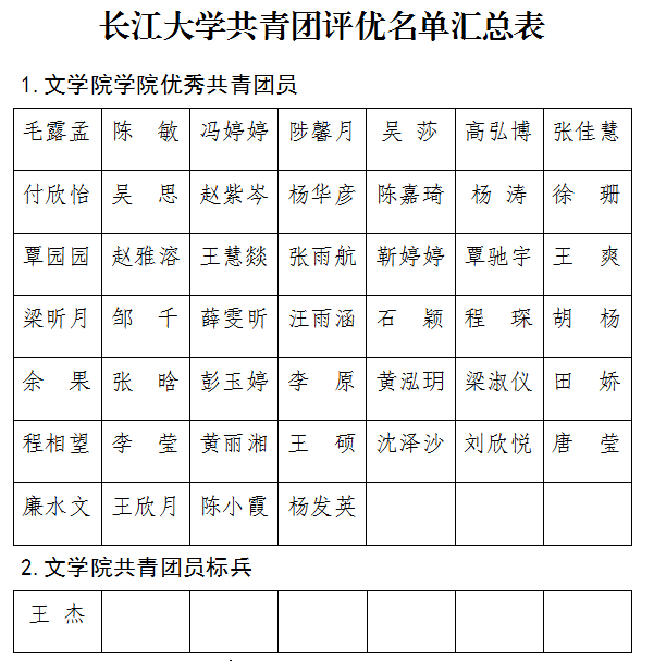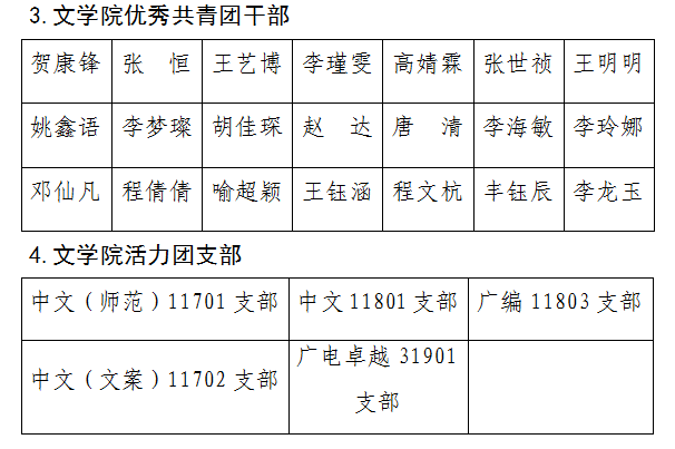 经个人申请、各支部推选、公司团委审核,拟推选毛露孟等46名同学评为“优秀共青团员”,王杰评为“共青团员标兵”,贺康锋等21名同学评为“优秀共青团干部”,中文(师范)11701支部、中文11801支部、广编11803支部、中文(文案)11702支部、广电卓越31901支部评为“活力团支部”,现予以公示。