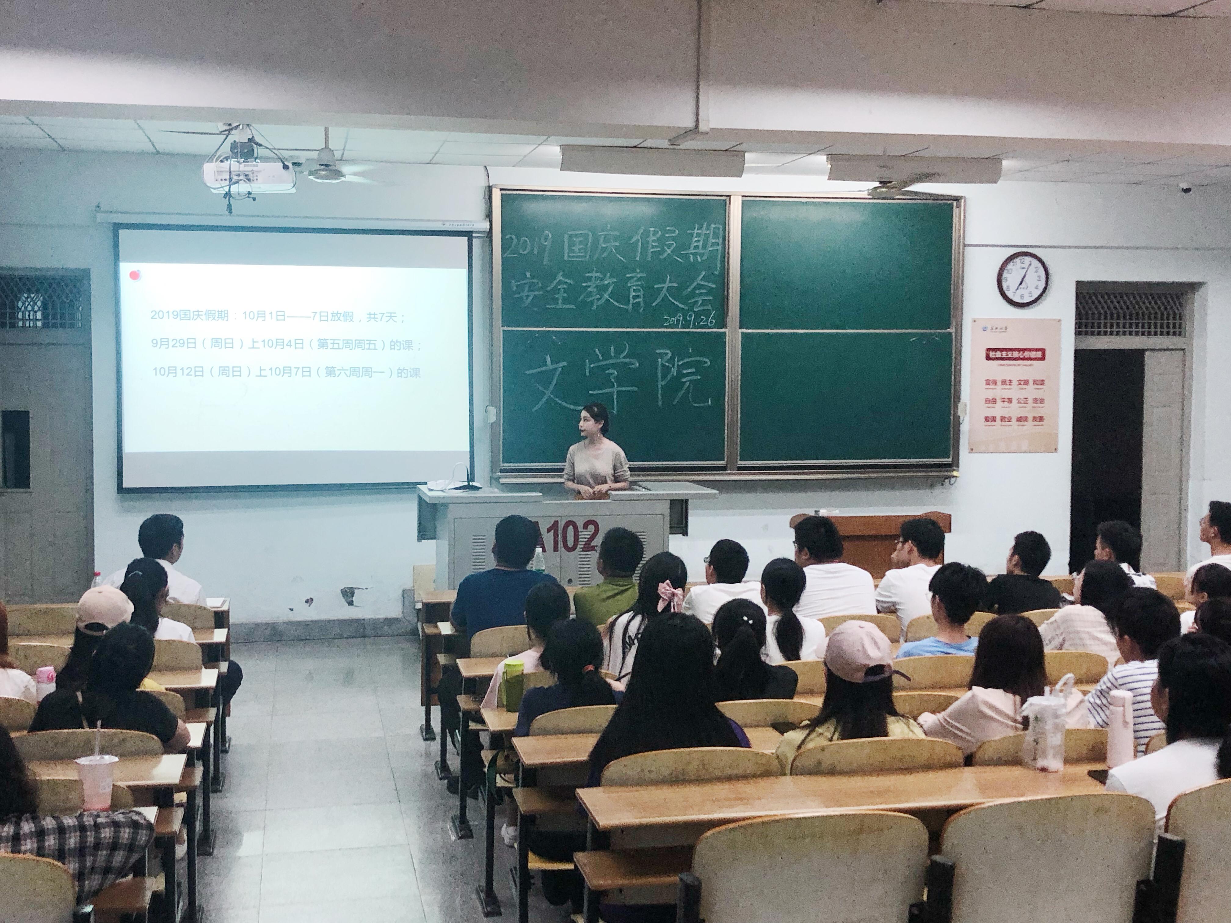 大会主要分为“国庆假期放假安排”、“国庆假期安全提醒”和“国家资助政策宣讲“三个部分。首先,对即将到来的国庆节假期,相应辅导员老师宣讲了假期的相关通知及规定。紧接着,各年级辅导员结合具体的安全教育案例,从多个方面讲述本次假期安全注意事项,并重点从人身安全、财产安全、出行安全、网络安全(网络诈骗)、宿舍安全、饮食安全、防火防盗防骗、心理健康和远离毒品等方面进行安全教育,要求同学们增强安全防范意识和自我保护能力,确保人身和财产安全。