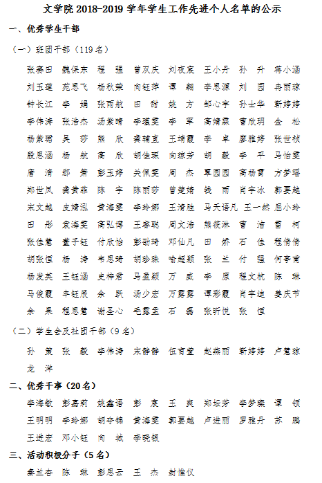 经个人申报、班级评选、员工事务办公室审核,授予张赛田等128名同学“优秀员工干部”称号,授予李海敏等21名同学“优秀员工干事”称号,授予秦兰杏等5名同学“活动积极分子”称号,现将评选结果予以公示。