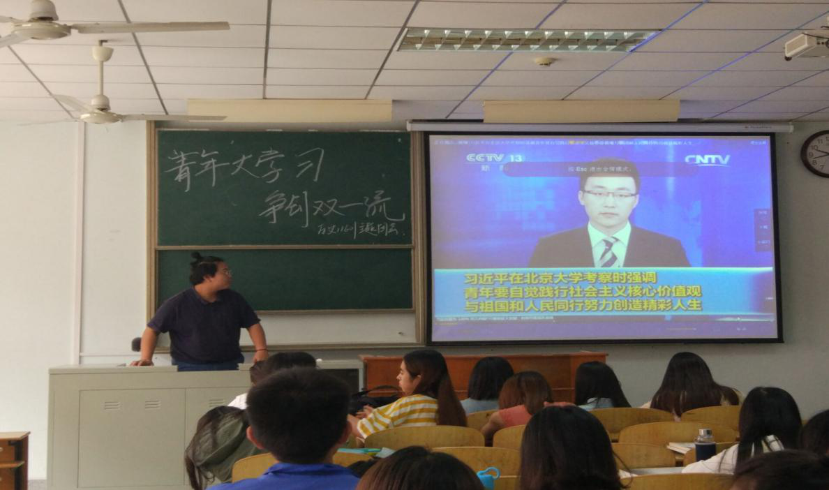 图四.历史11601班,主持人对于十九大相关精神进行了宣讲,呼吁同学们学习最新思想。观看习近平总书记考察北京大学的视频,号召同学们学习习近平总书记北京大学的讲话。