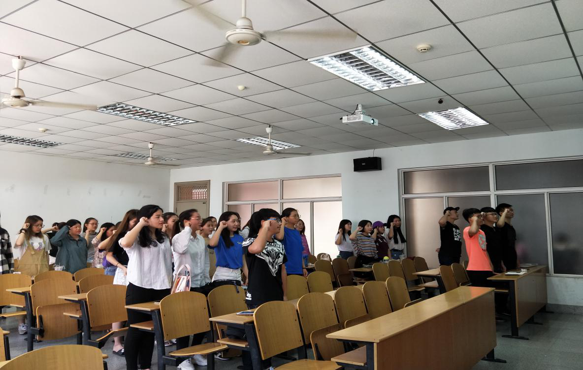 图三.广编11702班的同学在班长的带领下严肃地重新宣读入团誓言,手臂抬起,目光凝视,使同学们牢记作为一名共青团员的使命,重温入团庄严感。