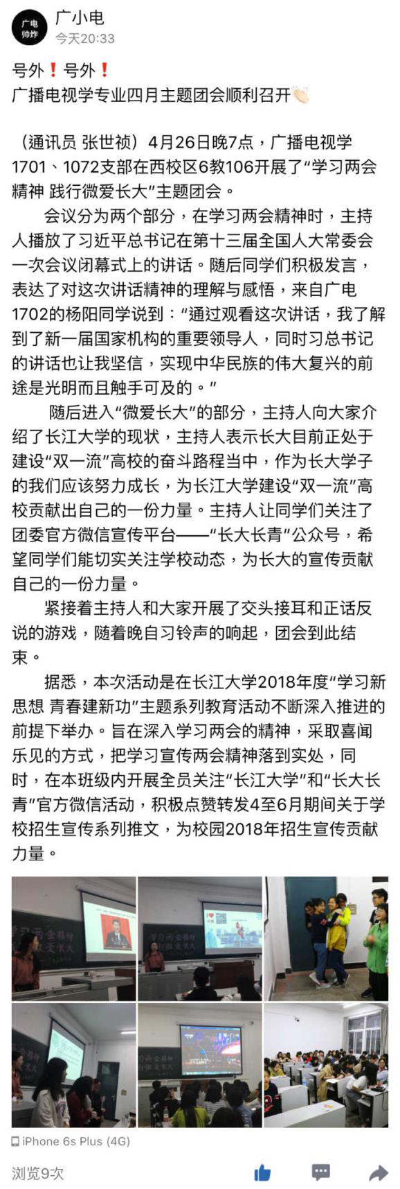 团支部再次开展了对两会内容和精神的学习,并通过视频、图片和问答等多种形式展开,达到了良好的学习效果。优秀共青团员、入党积极分子同学发表了学习感悟。