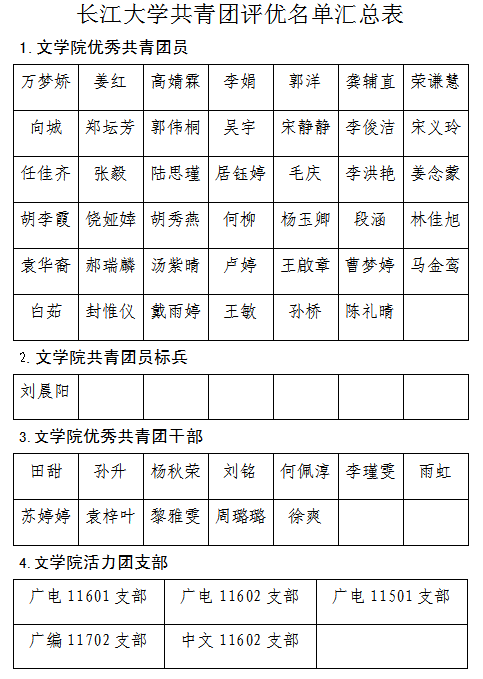 经个人申请、各支部推选、公司团委审核,拟推选姜红等41名同学评为“优秀共青团员”,田甜等12名同学评为“优秀共青团干部”,刘晨阳评为“共青团员标兵”,广电11601支部、广电11602支部、广电11501支部、广编11702支部、中文11602支部评为“活力团支部”,现予以公示(名单见附件)。