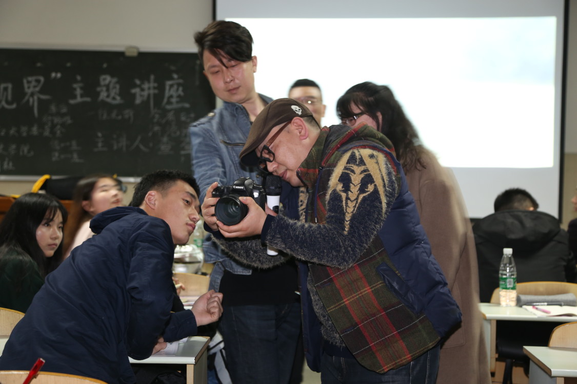 紧接着,主讲人查查上台给同学们讲解摄影的知识及拍摄技术。讲解之前,他和同学们一起欣赏了一部“追逐梦想”的微电影。他通过“女孩子的特写”、“女孩子在江边”等镜头来讲解拍摄技巧。他强调,在一部片子中,最重要的是“情绪和人文”。讲解过程中,查查老师非常注重同学们的实践动手能力,他不时与同学们进行互动,比如两位摄影爱好者主动担任模特;一位爱好者现场拍摄了一段视频;查查老师通过现场拍摄短视频来加深同学们对拍摄技巧的理解。拍摄技巧固然重要,但没有良好的拍摄设备也会让拍摄者产生“巧妇难为无米之炊”的无奈感,所以查查老师最后特地为同学们介绍了摄影所需要的工具。