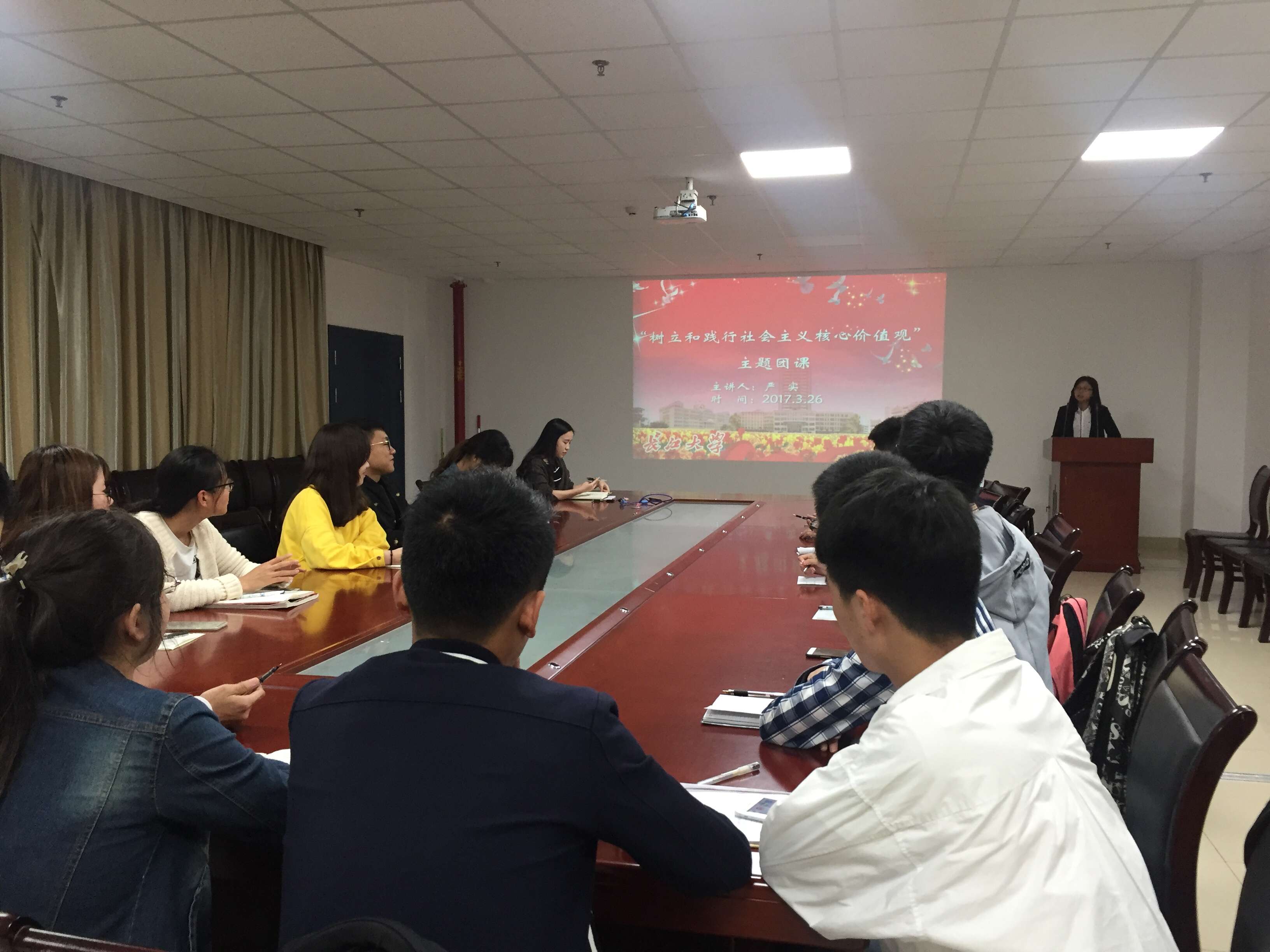 (通讯员 袁华裔)5月3日中午12时,文公司“树立和践行社会主义核心价值观”主题团会在0705会议室召开。主讲人为辅导员严实,参加会议的有文公司团委宣传部、组织部全体成员以及部分班级团支书。
