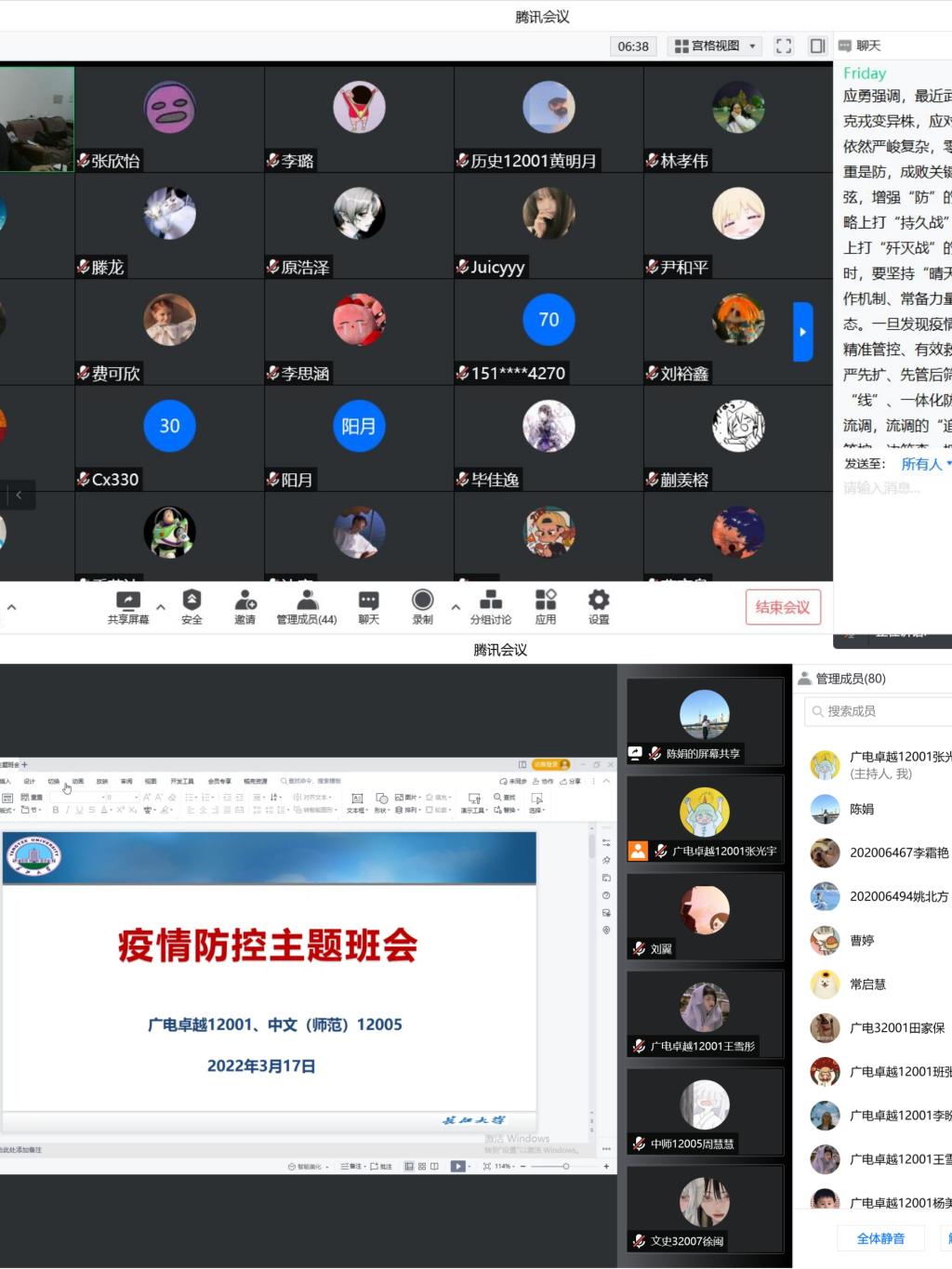 为切实做好校园疫情常态化防控工作,统筹疫情防控和事业发展,根据公司防控要求,公司全体辅导员、班主任于3月15日至17日,采取线上+线下相结合的方式,面向全体本科生和研究生开展了“疫情防控”主题班会。
