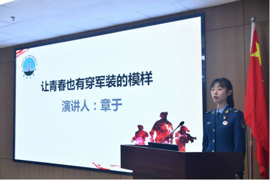 章于同学开篇分享了自己在中国人民解放军驻港部队服役的经历。谈到从最初的懵懂到成长为一名军人,她有过失落,但是更多的是收获到自信和坚韧。军旅生活使她的理想信念更加坚定,青春也因此更加闪耀。之后,她讲述了自己退役后的老员工活。作为一名退伍的老员工士兵,复学后她始终保持军人本色,勇担青年时代责任,成为了荆州市征兵宣传大使,也多次担任公司新生军训教官。“退伍不褪色,让青春也有穿军装的模样”,主讲人的铮铮誓言令在场的同学们肃然起敬、热血沸腾。最后,主讲人与公司研究生们进行交流互动,话题从征兵政策到绘画知识,现场气氛融洽。