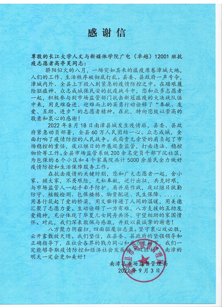 “在踏艰履险驱瘟神、众志成城保民安的抗疫战斗中,您和众多志愿者一起,积极参与到市场监管部门抗击新冠瘟疫的大决战队伍中来,用克难奋进、迎难而上的英勇行动诠释了‘奉献、友爱、互助、进步’的志愿者精神。在此,特向您致以崇高的敬意和衷心的感谢!”近日,公司收到了一封特别的来信——来自南漳县市场监督管理局的感谢信。