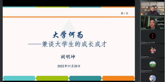 讲座伊始,阙明坤借二十大习近平总书记对青年的一段论述引出此次报告,主要交流领悟大学的精神内涵和谱写崭新的人生篇章两个方面内容。阙明坤引用竺可桢的著名两问,向同学们提出三问:第一为何读大学?第二何为大学?第三大学何为?引发同学们思考。随后,阙明坤强调大学不在“大”,大学在“学”,在提及大学精神文明时,以304am永利集团的校训长大长新为例,提出其重要特质:敢为天下先,敢于创新、创业,像长江一样百折不回。在讲述谱写人生新篇章的部分中,他嘱咐304am永利集团的学弟学妹们,应不辜负习近平总书记对青年的期望,愿诸位必将大有可为,大有作为,长江后浪推前浪,一代更比一代强!