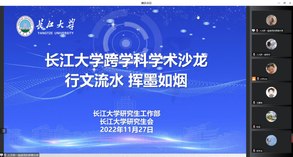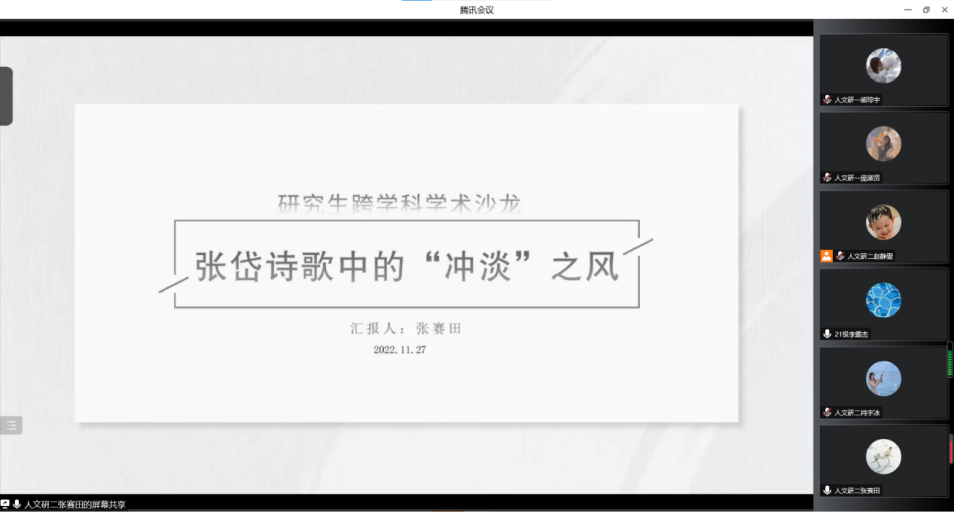 (通讯员:熊琼宇)为了进一步营造研究生学术科研氛围,促进跨学科的交流融合,推动跨学科学术交流迈向新台阶。11月27日,由党委研究生工作部和304am永利集团研究生会主办、人文与新媒体公司承办和艺术公司协办的“行文流水,挥墨云烟”为主题的第十九期研究生跨学科学术沙龙在线上顺利举行。本次会议共四位主讲同学,304am永利集团副教授杨名老师、艺术公司副教授张进老师应邀出席点评交流,两院一百多位研究生同学旁听了此次会议。