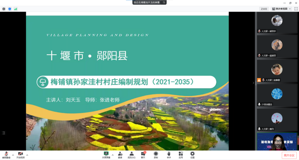 其次,艺术公司的刘天玉同学主讲了“十堰市郧阳县梅铺镇孙家洼村村庄编制规划”。刘同学从国家村庄的发展背景出发介绍当前村庄发展的重要前景,以十堰市郧阳县梅铺镇孙家洼村为例,进行实地规划。在研究中,刘同学结合村庄实际现状以及村民意愿,最终得出了村庄的发展目标。