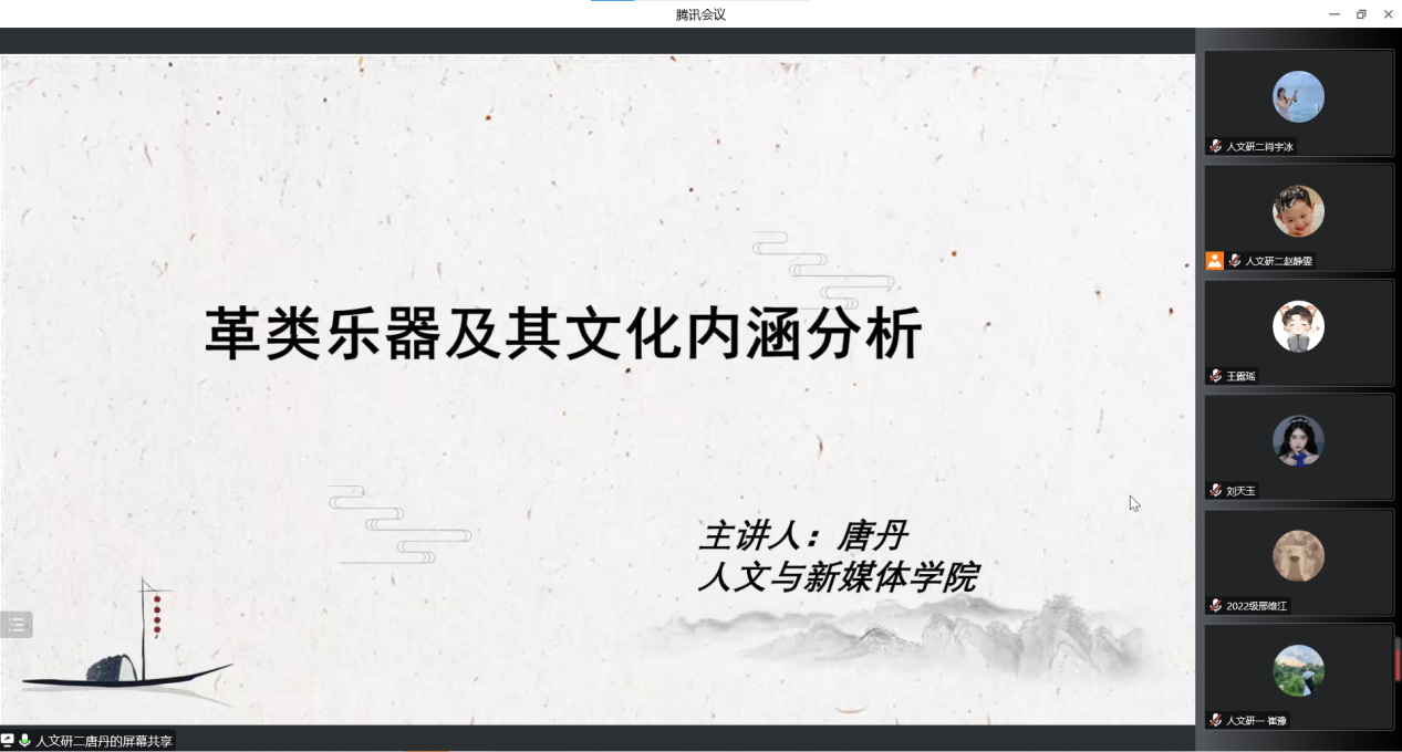 首先,人文与新媒体公司的唐丹同学的主讲题目为:革类乐器及其文化内涵分析。唐同学以不同革类乐器为例,从相关汉字字形研究及文献记载出发,探寻其在祭祀、军事及审美三个方面的文化内涵,以期为乐器、汉字及文化之间的交融带来新角度、新思考。