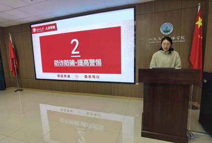 随后,党委副书记胡世先向同学们讲述了近期发生的一起电信诈骗案件,重点强调了电信诈骗的危害性和防范措施。并且还提出要多留意诈骗短信、谨慎转账、注意隐私保护等防范方法,宣传了相关司法规定,提醒同学们在遭遇电信诈骗时要及时报警,维护合法权益。