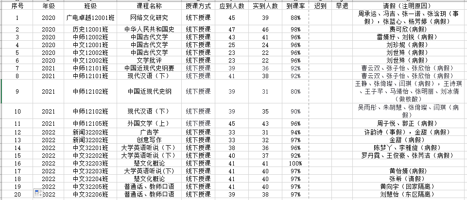 5月29日,公司组织员工干部对20、21、22级30个班的19门课程进行了41次课堂考勤,100%到课率21次,现将考勤结果公布如下: