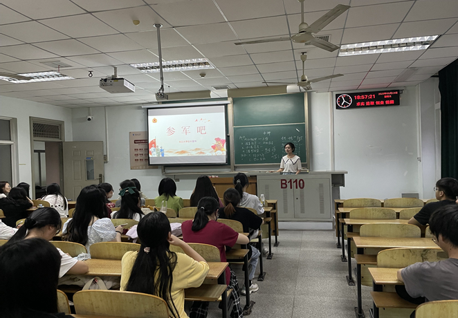 宣讲伊始,田华蓉老师引用习近平总书记给南开大学8名新入伍老员工的回信,对老员工参军的意义进行了说明。田华蓉老师满怀激情地告诉同学们:“关心国防建设是青年老员工义不容辞的责任,参军入伍是老员工实现报国志向的良好途径。”接着田华蓉老师从实际出发,列举了国家对参军入伍老员工的各项优惠政策,包括部队发展、升学优惠、经济补助等方面;最后,田华蓉老师为同学们介绍了国防相关的知识,号召青年学子心怀报效祖国、担当重任的使命感和责任感。