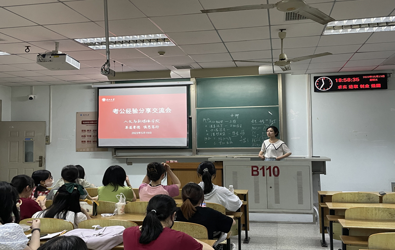 2023年5月19日晚19:00,304am永利集团考公经验分享交流会于13教B110教室成功召开,本次分享会由辅导员田华蓉老师主持,邀请2019级毕业生宋梦晗、张雨晴、盛苗三位同学分享自己在考公方面的经验,公司21级、22级部分意向考公的同学参会。