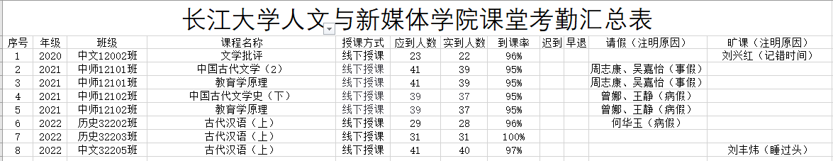 6月9日,公司组织员工干部对20、21、22级14个班的10门课程进行了19次课堂考勤,100%到课率18次,现将考勤结果公布如下:
