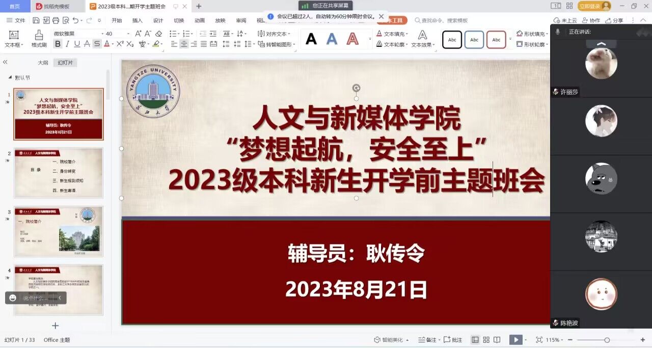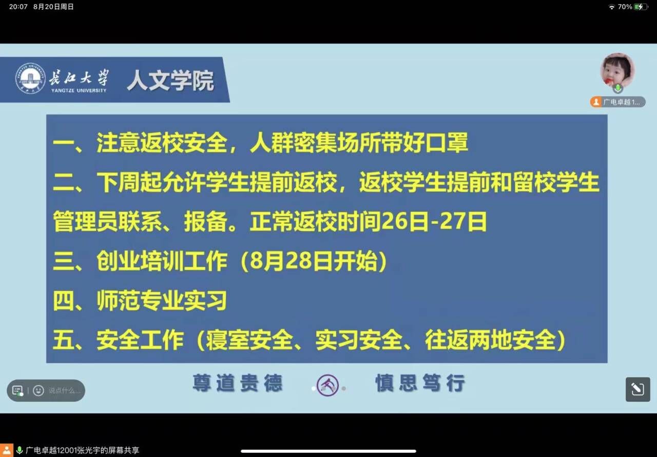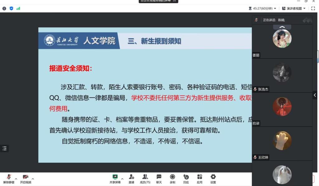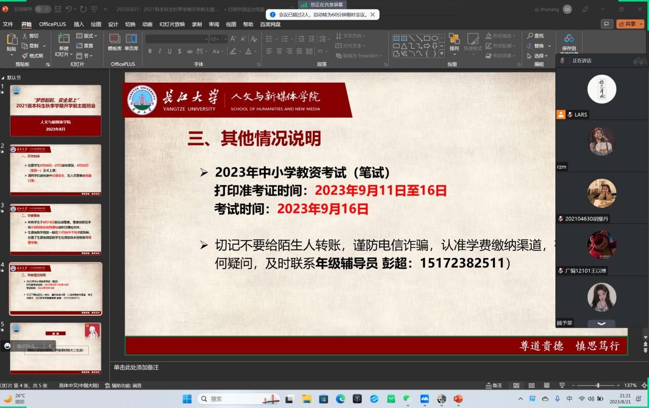 班会强调了开学时间和返校注意事项,提醒同学们注意返校安全,在人员密集场所佩戴好口罩,通过案例教学、安全提示等开展了生命安全教育、防溺水、防诈骗和心理健康教育,提高员工安全防范意识和自我保护能力。针对2023年2023级本科新生以及研究生新生,详细介绍了线上注册和线下报到的相关注意事项,在交流互动环节为同学们答疑解惑。