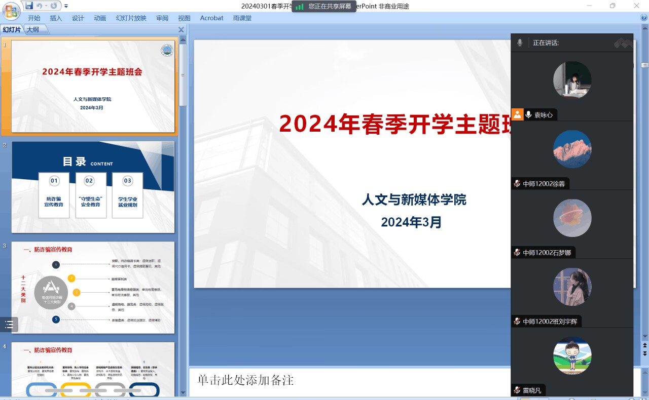 各班主要围绕防诈骗宣传教育、“守望生命”安全教育、学业及就业规划等方面进行教育与研讨,各年级有所侧重、形式多样。对低年级同学强调新学期目标及计划制定,引导他们积极参加创新创业活动;对高年级同学指导加强专业技能训练,锤炼过硬专业基本功,强化职业规划教育;对毕业班级员工强调实习及外出等安全问题,针对近期考研调剂、面试和招聘情况进行指导帮助,促进毕业生树立积极就业态度。