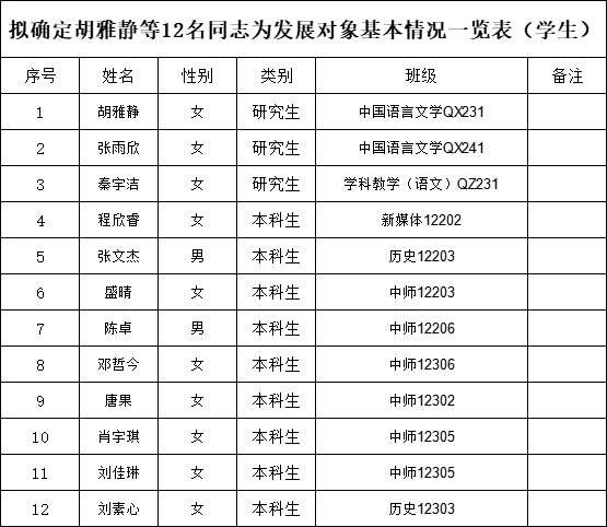 附:拟确定胡雅静等12名同志为发展对象基本情况一览表(员工)