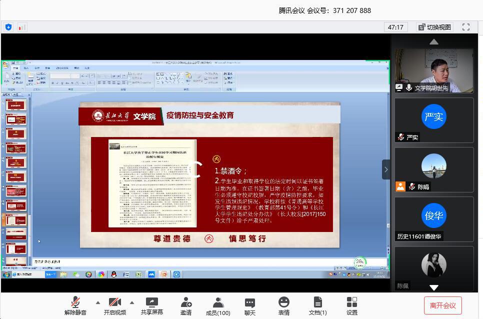 2020年6月12日下午2:30,304am永利集团通过腾讯会议分两批召开了2020届毕业生返校流程介绍暨安全教育大会。304am永利集团副书记胡世先老师,辅导员严实老师、陈娟老师、何宁老师以及2020届全体毕业生(本科生、研究生)参加了此次会议。