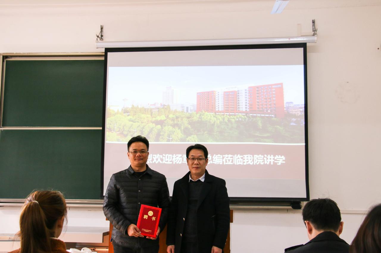 讲座开始之前,举行了简短的客座教授聘任仪式,由何世龙经理向杨章池主编颁发了聘书。接着,杨章池从六个方面开始他的讲座,他先结合数首诗歌,展示诗歌与我们的精神世界的紧密联系及诗歌怎样在当代社会中进行发声。然后他对新时期20年来诗歌发展中的重要事件,如“盘峰论争”、诗坛英雄排行榜及“梨花体”等进行了盘点。杨主编重点介绍了自己关于如何构建好诗的认识——构建好诗的六组要件:求小、求细、求重、求清、求近、求异,并带领同学们欣赏相应诗歌。讲座中,杨主编结合自己的创作经验,讲述诗歌是怎么来的,他说“诗歌是活出来的,看出来的、听出来的、摸出来的、读出来的……总之是感出来的”,“要做一个有心人”,他以自己的诗歌作品《古文人:理发师》《阳光现在沙拉碗上》《公交车独语》《姨婆和大姑》等,讲述自己的生活经验和创作灵感,让同学们懂得诗歌是来自生活的、是靠悟出来的!在最后的交流环节,杨主编还回答了同学关于如何创作新诗的问题。