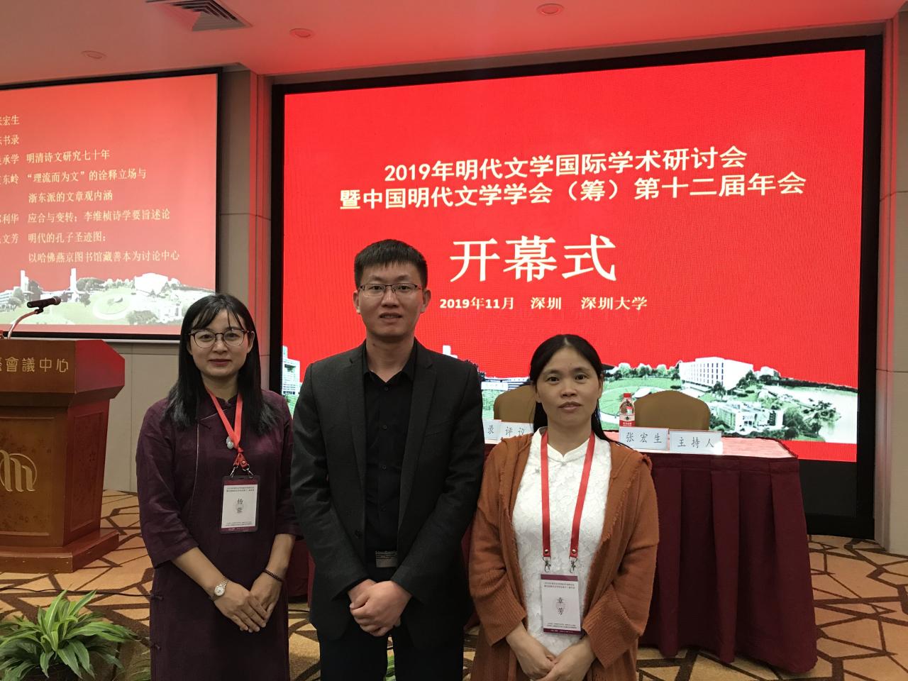 11月9日-10日,2019年明代文学国际研讨会暨中国明代文学学会(筹)第十二届年会在深圳明华国际会议中心召开。专家学者代表200余人出席会议,围绕明代各体文学研究、明代文学思想研究、明代文学与文化关系研究、明代文学文献研究、明代文员工态研究等主要议题展开热烈的讨论。本次会议共举行两场大会学术报告、四场分组讨论。本院李征宇、章芳、杨蓉三位教师参加本次研讨会,并提交3篇学术论文。