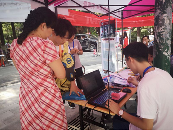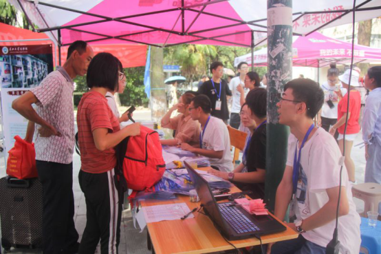 在公司报到注册点的现场,志愿者们来回穿梭,引导新生完成注册手续、帮拿行李、带领新生熟悉宿舍情况与校园环境。