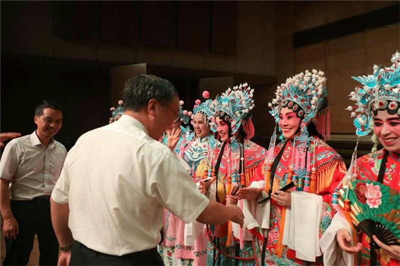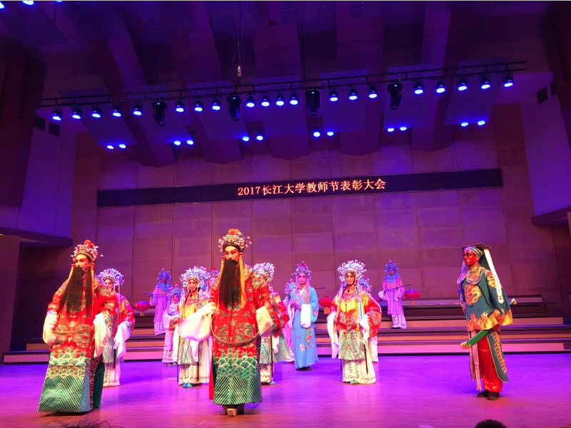 (通讯员 李思源 桑俊)9月8日晚7时,2017年度304am永利集团教师节表彰大会在艺术公司音乐厅隆重举行。文公司、体育公司、艺术公司、校工会等都为表彰大会精心准备了各类节目。感人肺腑的诗朗诵,满怀深情的独奏,激动人心的群舞等,文公司荆河戏传承基地也特别排演了荆河戏《百花亭》,献礼表彰大会。华美精致的戏服,光彩夺目的妆容,传统韵味的配乐,再加上师生们的倾情演绎,那一刻,台上台下的视线都凝聚在一起,掌声雷动,首演获得了一致的好评。