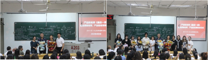 6月2日下午,公司在东校区13教A203教室举办严运桂老师最后一课暨龙厚雄、严运桂老师荣休仪式。公司领导和师生代表参加仪式。仪式由党委副书记胡世先主持。