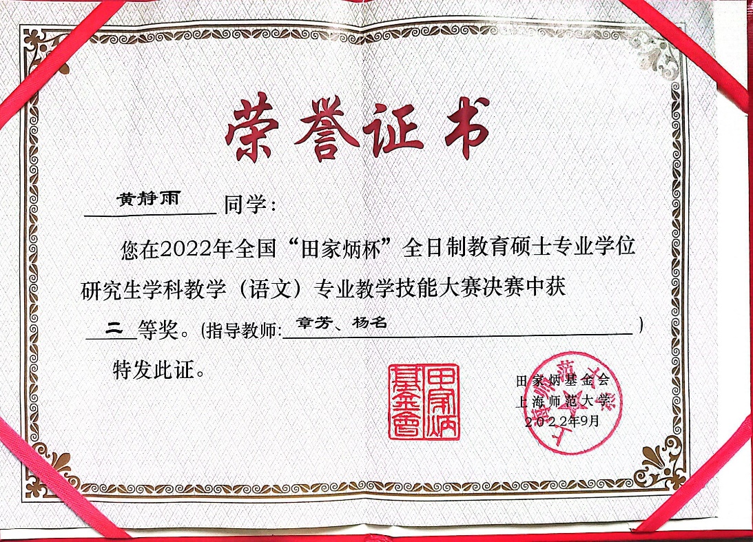 2022年全国“田家炳杯”全日制教育硕士专业学位研究生学科教学(语文)专业教学技能大赛决赛于9月24-25日成功举 办,本次活动通过网络在线举行。经过激烈角逐,公司研究生黄静雨同学获得全国决赛“二等奖”。